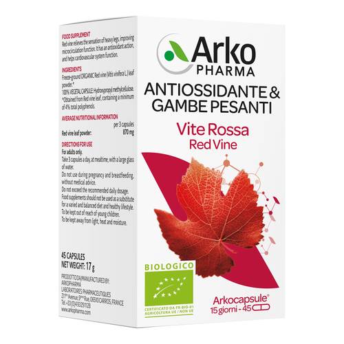 VITIVEN ARKOCAPSULE Integratore alimentare a base di vitis vinifera, indicato in caso di gambe pesanti. Modalità d'uso: 1 o 2 capsule, 2 volte al giorno, preferibilmente prima dei pasti. Avvertenze Non superare la dose giornaliera raccomandata. Tenere fuori dalla portata dei bambini al di sotto dei tre anni d'età. Gli integratori non vanno intesi come sostituti di una dieta variata. Per donne in gravidanza o allattamento e bambini si ricorda di sentire il parere del medico. Formato Confezione da 45 capsule. Cod. 91010192 / 91010305