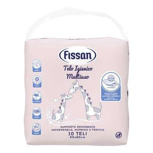 FISSAN BabyTelo Igienico Multiuso Telo pratico, igienico, confortevole supporto che può essere utilizzato ovunque grazie al suo ingombro limitato. Provalo non solo nel momento del cambio (fuori e dentro casa), ma anche in altre numerose occasioni, senza il rischio di lasciare il bambino a contatto con superfici non perfettamente pulite. Sistema filtrante a triplo strato con trama assorbente. Tessuto sviluppato per ridurre al minimo il rischio di allergie. Formato 10 pezzi. Cod. 59480